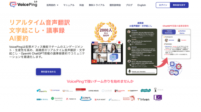 ChatGPTが搭載されたVoicePingは仮想バーチャルオフィスでありながら、英語でのWeb会議や商談といったシーンで議事録を作成するツールとしても優れている機能が多数搭載されています。