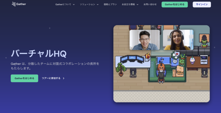 Gather(ギャザー)は、ピクセルアート風の空間を自由に歩き回れる2D仮想オフィスツールです。オフィスだけでなく、オンラインイベントやチームビルディングにも活用でき、「空間×会話」を組み合わせた自然なコミュニケーションが実現できます。
