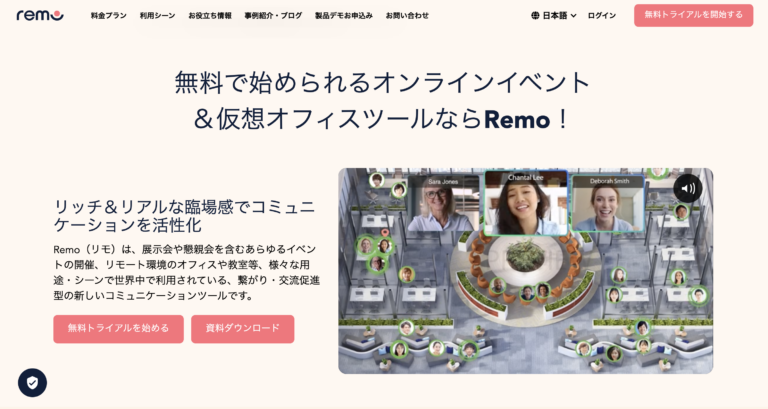 Remo(リモ)は、オンラインイベントやチームミートアップ向けに最適化された仮想空間プラットフォームです。アバターでテーブル間を自由に移動しながら、「誰と、どこで、何を話すか」を選べる、まるで本物の交流イベントのような体験が特徴です。