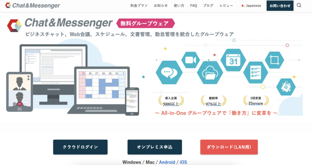 Chat&Messengerは、ビジネスチャット、Web会議、ファイル共有、スケジュール、文書管理、勤怠管理を一つのプラットフォームで統合した国産グループウェアです。複数のアプリケーションを使い分ける手間がなくなり、チームワークと生産性が格段に向上します。