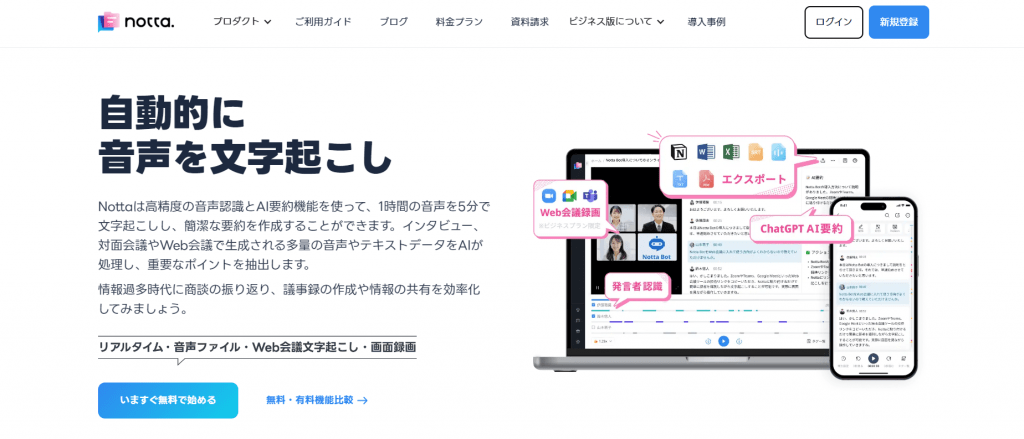 Nottaは、オンライン会議のために設計された翻訳ツールで、高精度なAIによる文字起こしが特徴です。会議中の発言がリアルタイムで文字起こしされ、その内容が即座に翻訳されるため、ビジネスの場で議事録作成の時間を大幅に短縮できます。リアルタイム文字起こしや翻訳、自動要約機能を活用することで、会議の内容を簡単に編集したり、複数のユーザーと協力して編集したりすることが可能です。