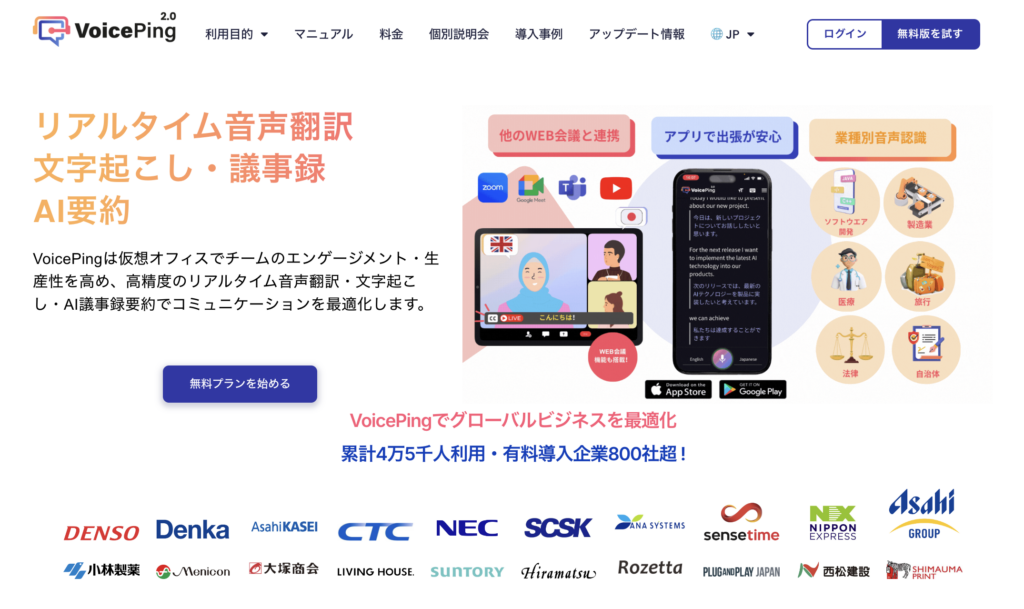 VoicePingは音声アプリが搭載された仮想オフィスツールです。その中でも、音声翻訳機能は外部のオンライン会議から対面イベントまで多用途に活用できることが特徴です。アクティブユーザー数は45,000人以上で、NEC、Asahiグループ、SCSK、伊藤忠、株式会社デンソーなどの日本企業が導入しています。